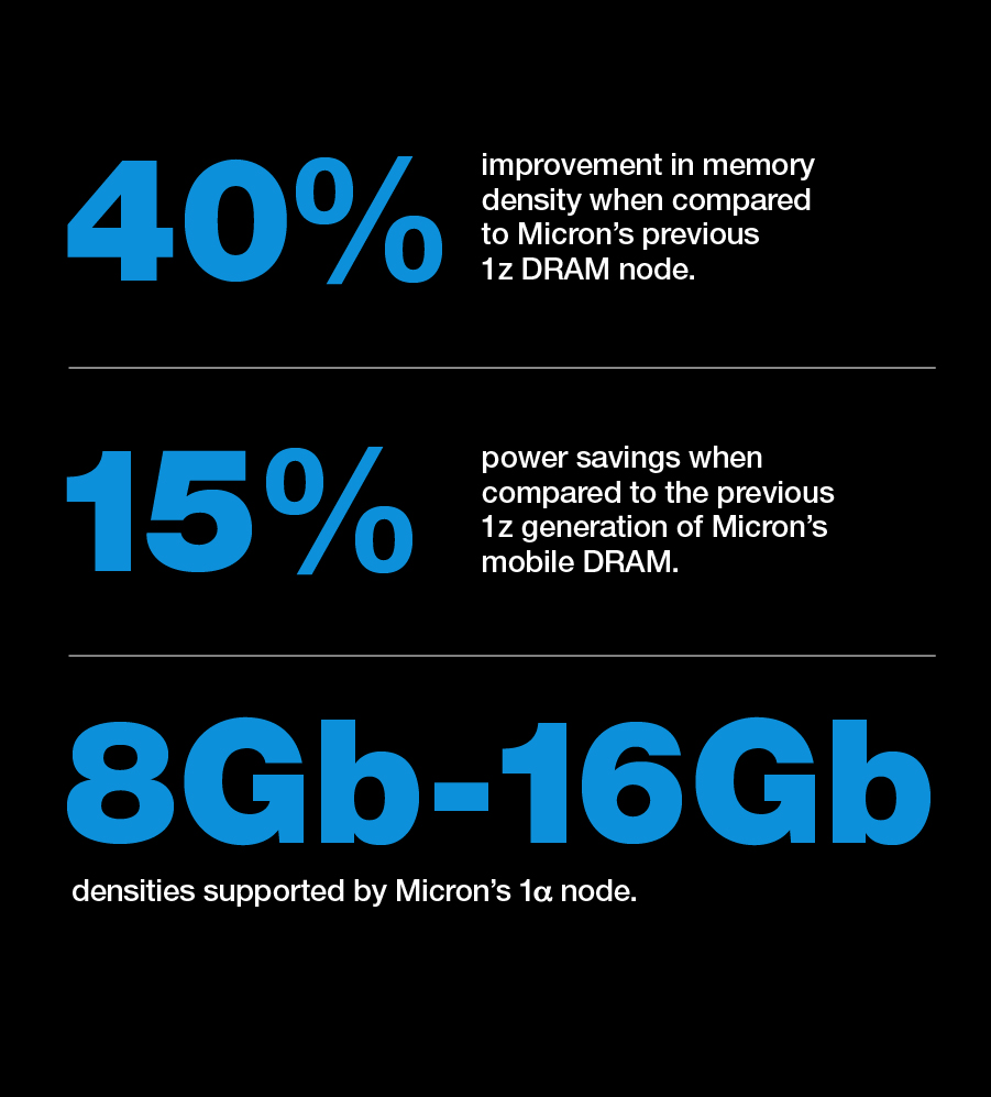 Micron's 1α DRAM technology enables lower-power mobile DRAM and provides fast LPDDR5 operating speeds for mobile platforms that require no-compromise LPDRAM performance.